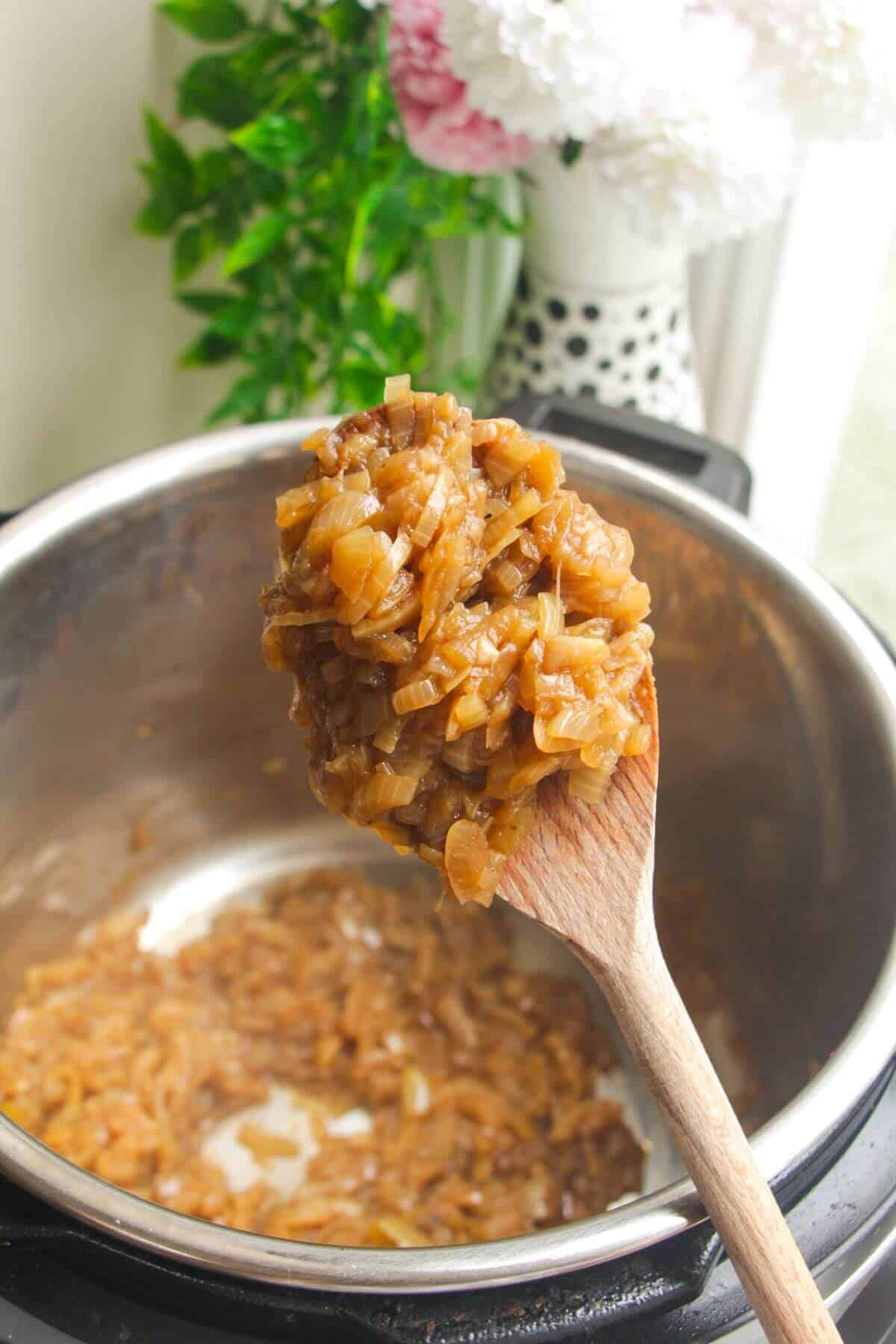- Deglaze and finish caramelizing the onions. Pour about ⅓ cup of water into the Instant Pot, then use a wooden spoon to scrape any browned bits from the bottom of the pot (this is flavor!) Continue cooking for another five minutes, until the water evaporates and your onions are deeply golden, sticky, and jammy.