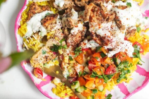 This is one that’s been on firm rotation in my house and I suspect it might become a favorite for you too. These lovely bowls are inspired by two things – chicken gyros and the iconic halal cart chicken bowls you’ll find all over New York City. Here, I’ve kind of combined the two!